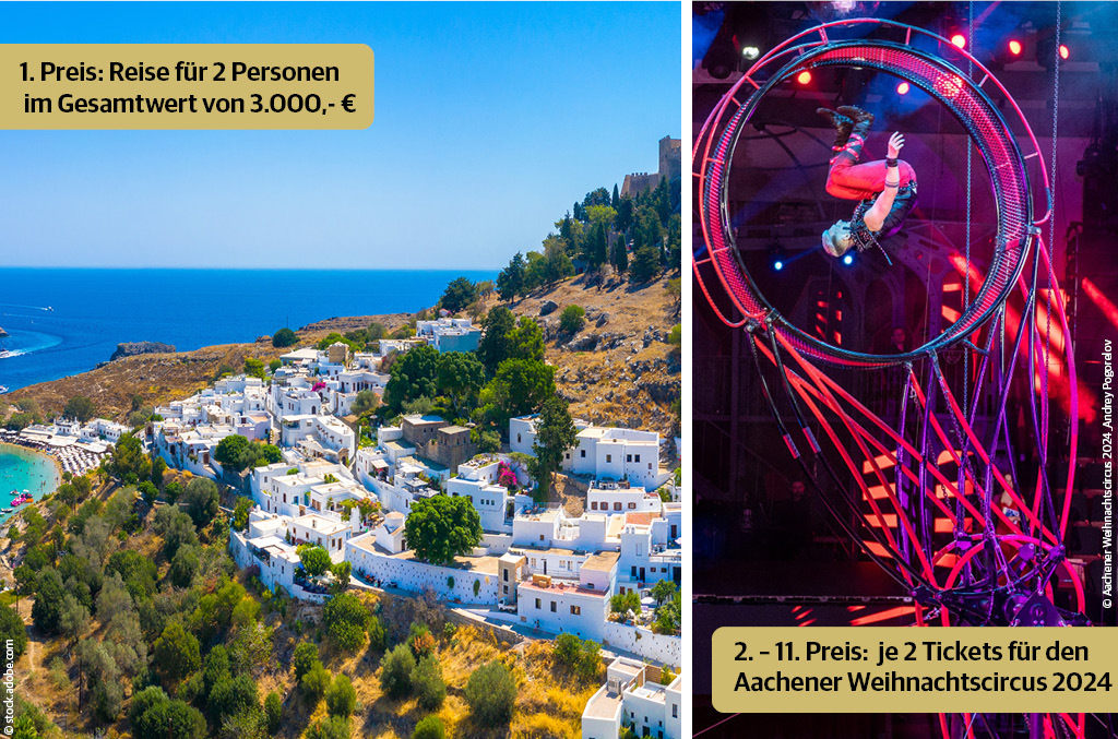 Seien Sie dabei: Sichern Sie sich vom 22.11. bis einschließlich 22.12.2024 Ihre Gewinnchance und gewinnen Sie mit etwas Glück eine Reise für zwei Personen im Gesamtwert von über 3.000€! Wir schicken Sie für 1 Woche (02.05. – 09.05.2025) auf die schöne Insel Rhodos, wo Sie im 4-Sterne Hotel „Apollo Beach“ in Faliraki übernachten – Flug und Ausflüge inklusive*.