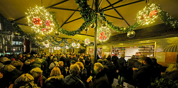 Au-dessus de l'agitation du marché de Noël d'Aix-la-Chapelle, la cage dorée située sur la terrasse du Ratskeller vous invite à faire une pause. Entouré d'une lumière chaleureuse, vous profiterez ici d'une vue exceptionnelle sur la place Katschhof décorée pour les fêtes, avec une vue directe sur la majestueuse cathédrale d'Aix-la-Chapelle et l'hôtel de ville. Qu'il s'agisse de vin chaud classique, de spécialités maison ou de punch chaud, la cage dorée allie le confort hivernal à une vue unique. Un endroit parfait pour découvrir la magie de l'Avent dans une atmosphère particulière.