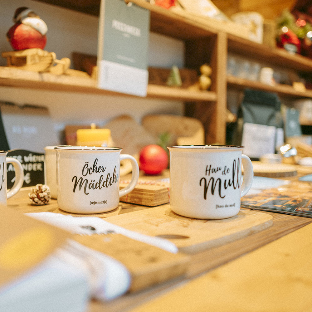 Tasses, bols, verres, sacs en jute, calendrier, chaussettes. . . tout est de retour, mais dans un tout nouveau look & feel. Nous sommes impatients de vous voir. Venez nous rendre visite et commencer une conversation captivante et drôle dans et sur l'Öcher Platt avec nous.