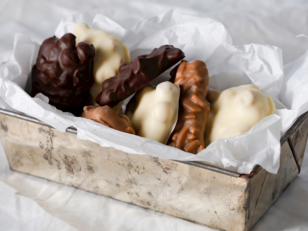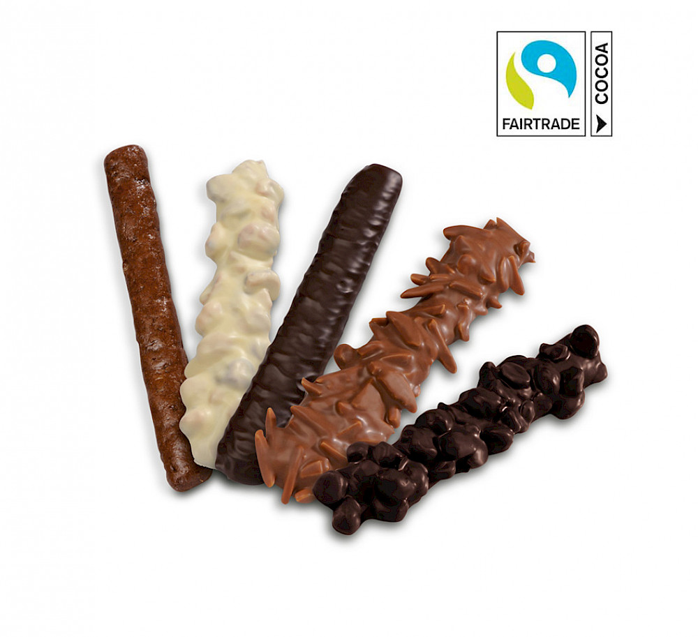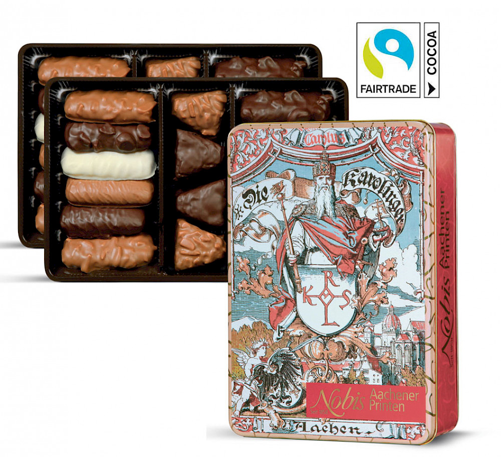 Nous utilisons exclusivement des chocolats certifiés Fairtrade afin d'habituer "équitablement" les gourmets du monde entier. Ainsi, à chaque bouchée, nos spécialités vous promettent un morceau d'artisanat équitable et honnête de la ville impériale d'Aix-la-Chapelle.